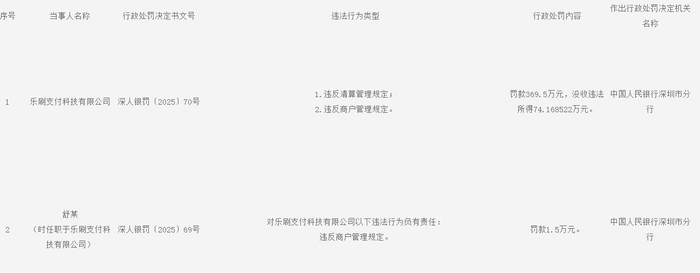 11月28日,中国人民银行深圳市分行披露的行政处罚决定信息公示表显示,乐刷支付科技有限公司(下称“乐刷支付”)因违反清算管理规定、违反商户管理规定,被处以罚款369.5万元,并被没收违法所得74.168522万元。同时,舒某因对乐刷支付违反商户管理规定负有责任,被处以罚款1.5万元。