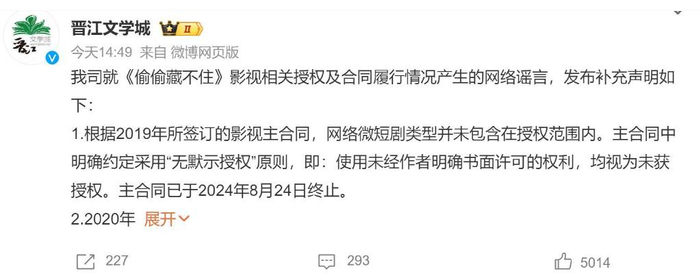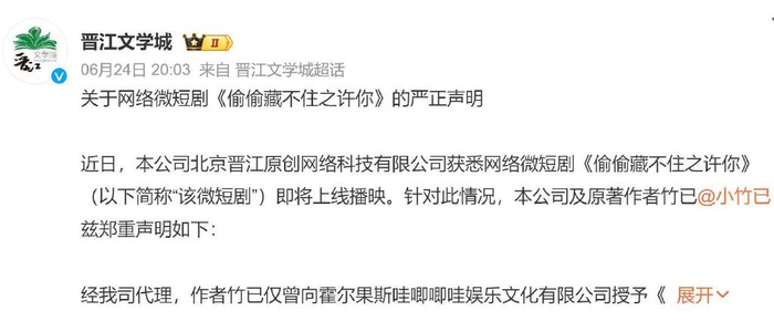 6月24日晚,晋江文学城所属的北京晋江原创网络科技有限公司发布严正声明,称经其代理,原著作者竹已仅向霍尔果斯哇唧唧哇娱乐文化有限公司授予《偷偷藏不住》的网络剧改编权等相关权利,并未授权网络微短剧改编权。且在双方签订的授权合同补充协议中,明确约定哇唧唧哇不得将改编作品再次改编为网络微短剧。