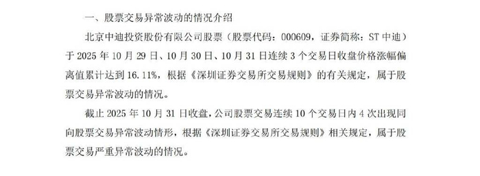 公告显示,ST中迪股票于10月29日至31日连续3个交易日收盘价格涨幅偏离值累计达16.11%,且截至10月31日收盘,该公司股票在连续10个交易日内4次出现同向异常波动,触发严重异常波动标准。