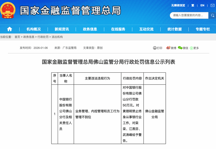 1月6日,中国银行佛山分行因业务管理、内控管理和员工行为管理不到位,被国家金融监管总局佛山监管分局罚款50万元,相关责任人黄锶明被禁止终身从事银行业工作,栾栾、江燕芬、武涛峰被给予警告。