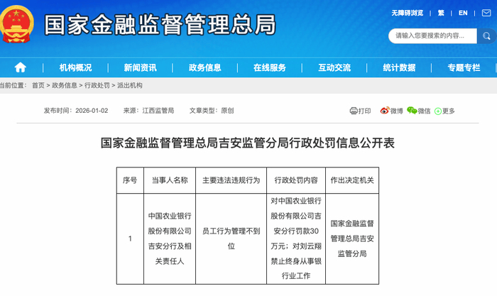 1月2日,由于员工行为管理不到位,中国农业银行吉安分行被国家金融监督管理总局吉安监管分局罚款30万元,刘云翔被禁止终身从事银行业工作。