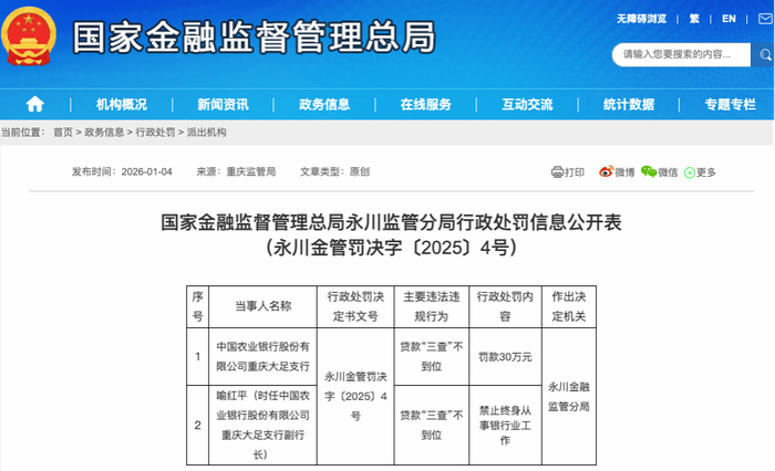 1月4日,中国农业银行重庆大足支行由于贷款“三查”不到位被国家金融监督管理总局永川监管分局罚款30万元,时任大足支行副行长喻红平被禁止终身从事银行业工作。