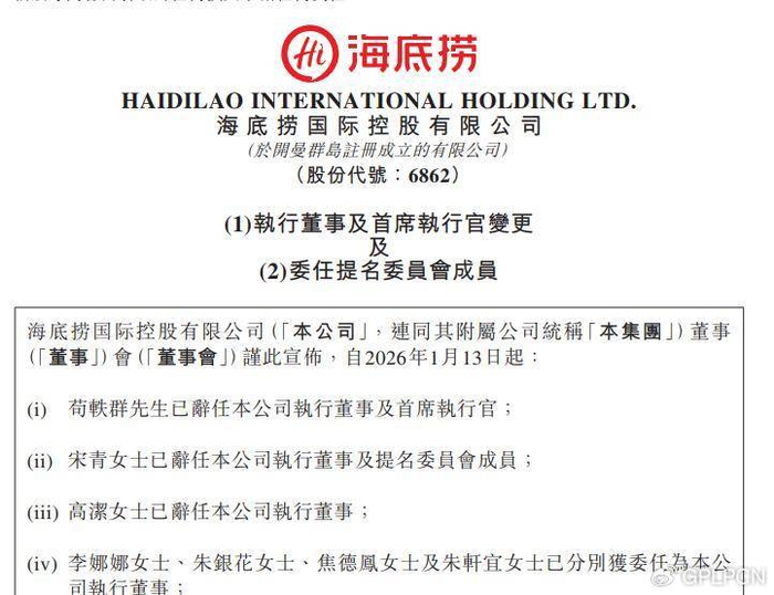 2026年1月13日,海底捞在港交所发布公告称,创始人兼董事会主席张勇将兼任公司首席执行官,而原首席执行官苟轶群已辞任相关职务。
