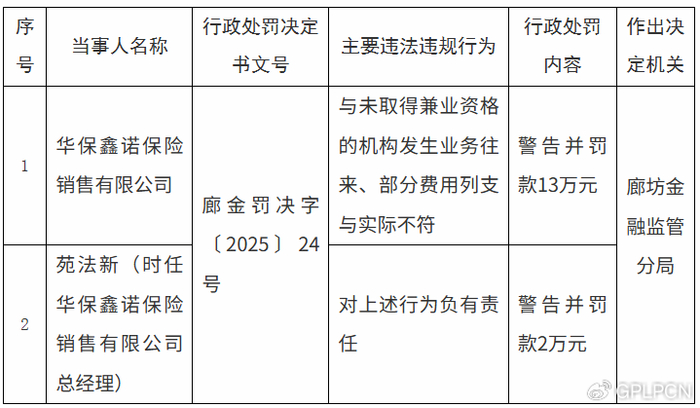 1月20日,廊坊金融监管分局发布的行政处罚信息公开表显示,华保鑫诺保险销售有限公司(以下简称“华保鑫诺保险销售”)因与未取得兼业资格的机构发生业务往来、部分费用列支与实际不符,被警告并被罚款13万元。时任公司总经理苑法新因对上述行为负有责任,被警告并被罚款2万元。