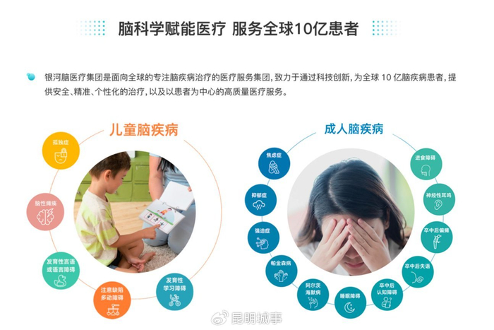 在这里,我们见证了无数像灿灿这样的家庭,在绝望的深渊中重新燃起希望的火花。银河脑医疗益青源云南中心在脑功能环路研究领域经验丰富,“优点疗法”更是能广泛治疗临床心理科、神经内科、儿科等三大板块的脑疾病。无论是青少年还是成年人,因各种压力导致的抑郁症、焦虑症、强迫症、睡眠障碍,或是银龄人群常见的帕金森病、阿尔茨海默症;亦或是儿童的脑瘫、多动症、学习困难、孤独症、发育性言语或语言障碍等疾病,以及成人、老年人中风后引发的失语、偏瘫、认知障碍、偏盲等问题,目前已有16种脑疾病在临床治疗上取得了突破性的显著疗效。银河脑医疗,凭借其先进的技术、专业的团队、个性化的贴心服务,为这些患者搭建起了一座通向健康的坚实桥梁。这不仅仅是医学技术层面的创新突破,更是对生命崇高的尊重与敬畏,是爱与希望最真实的具象化表达。