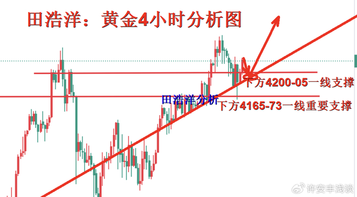 从4小时图走势来看,上方重点关注4250-60一线重要压制,下方关注4200-4195一线短期支撑,关注4165-75一线重要支撑,技术上震荡更倾向于调整回落做多,我们耐心等待关键点位进场。具体操作策略我会在盘中提示,及时关注。