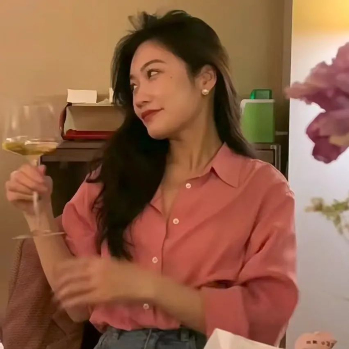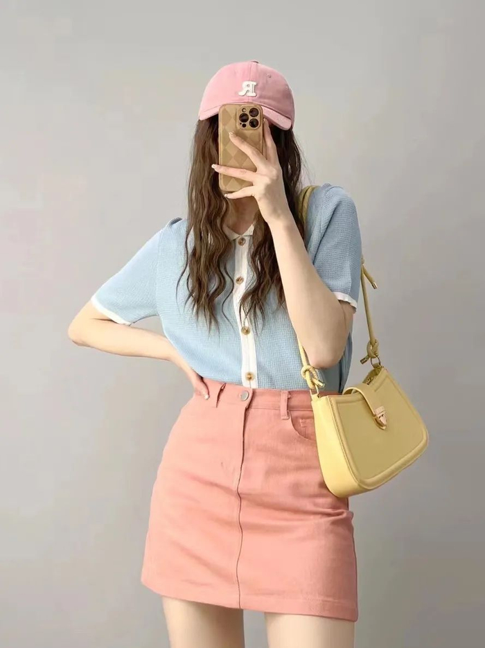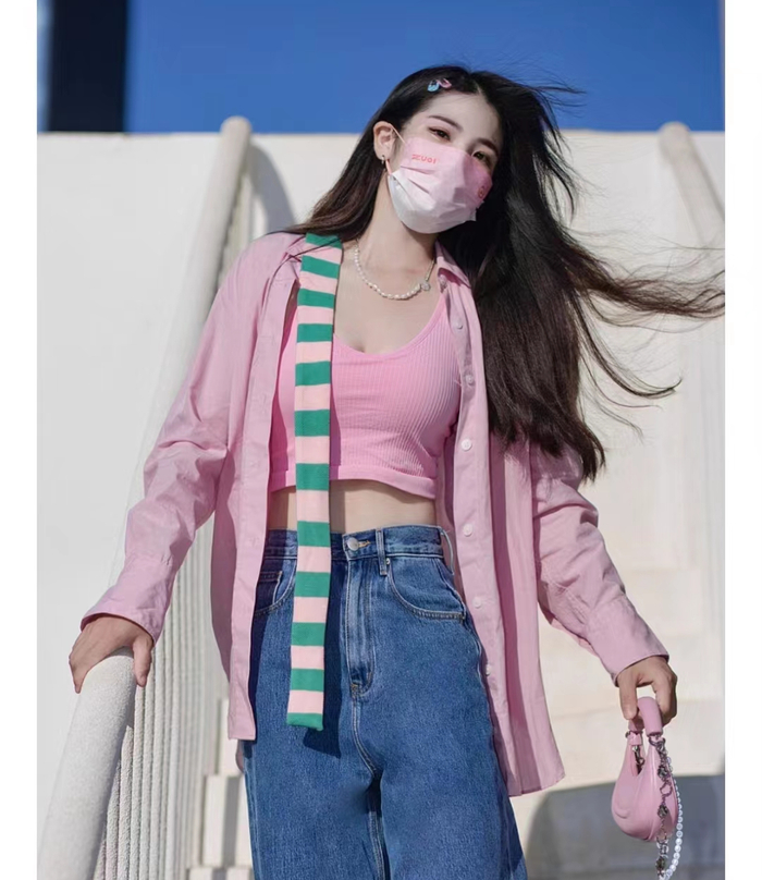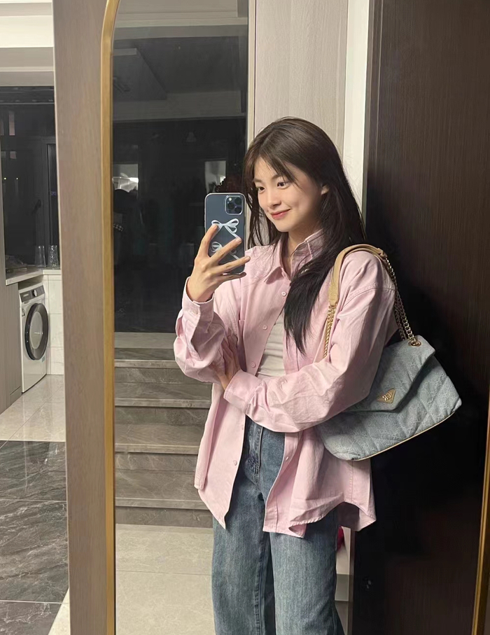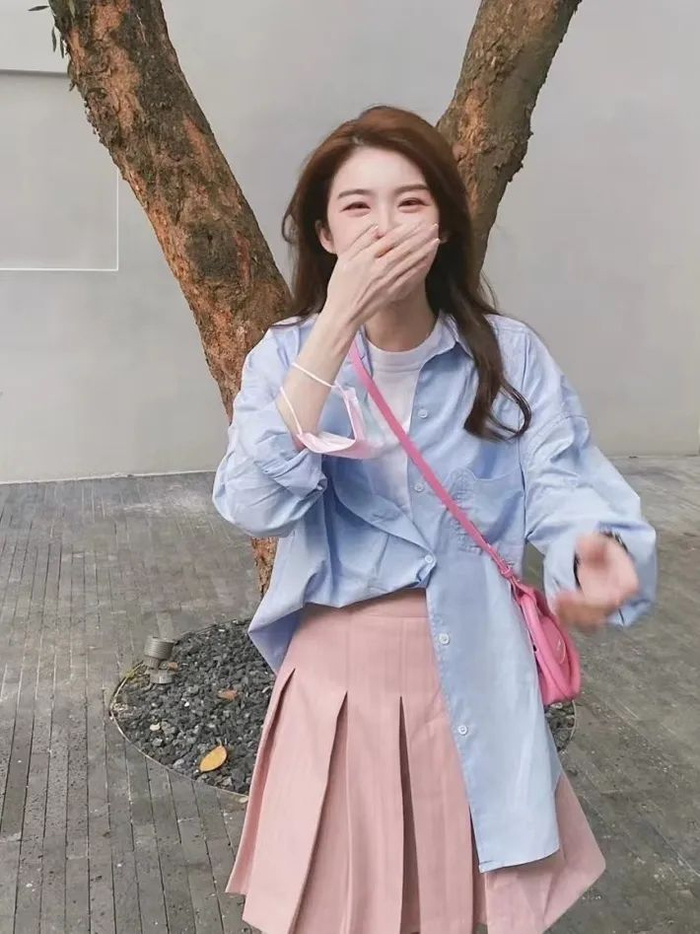 最常见的淡蓝色衬衫,适合搭配同样淡淡的樱花粉,少女感溢出屏幕。