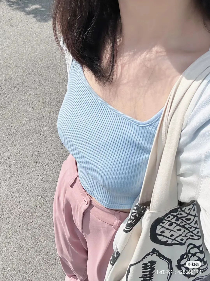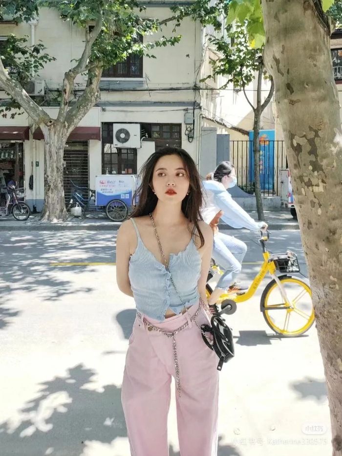 休闲的樱花粉的衬衫里面穿一个奶白色的吊带,就像是草莓组合海盐,看着就软软糯糯的,心情大好。