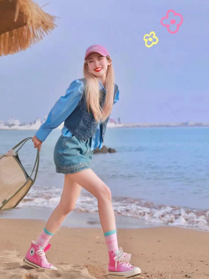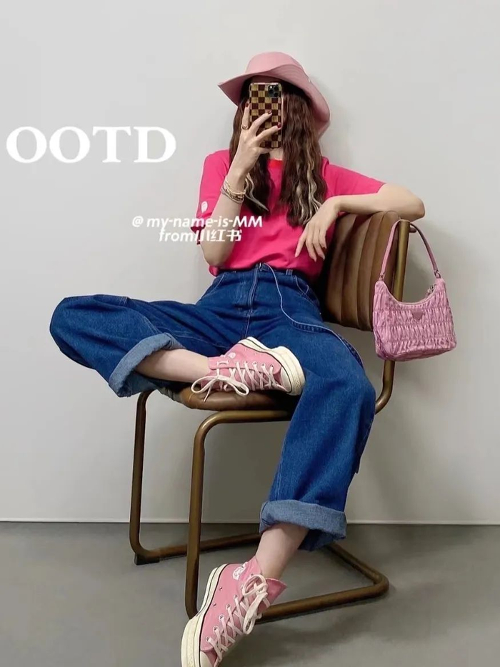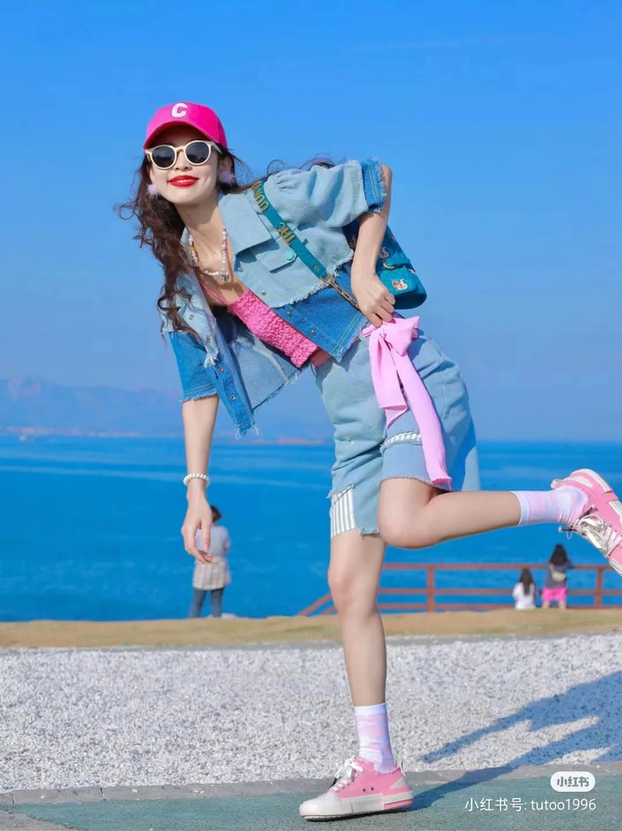 熟悉了粉蓝配色,赶紧用一抹粉色来提亮夏天的浅色牛仔套装吧~
