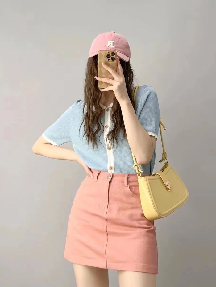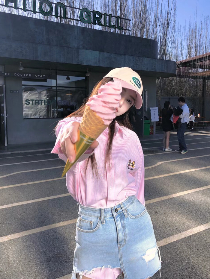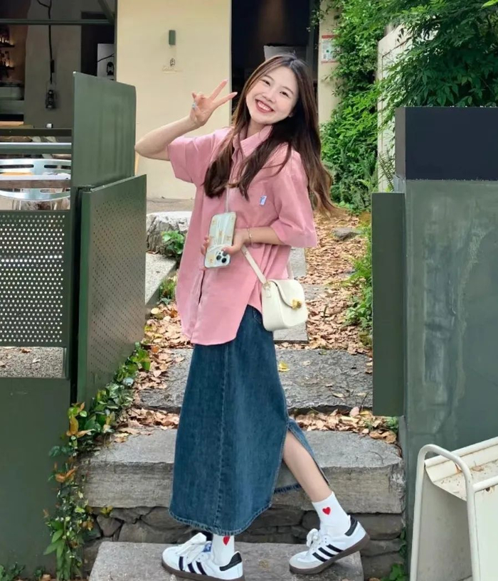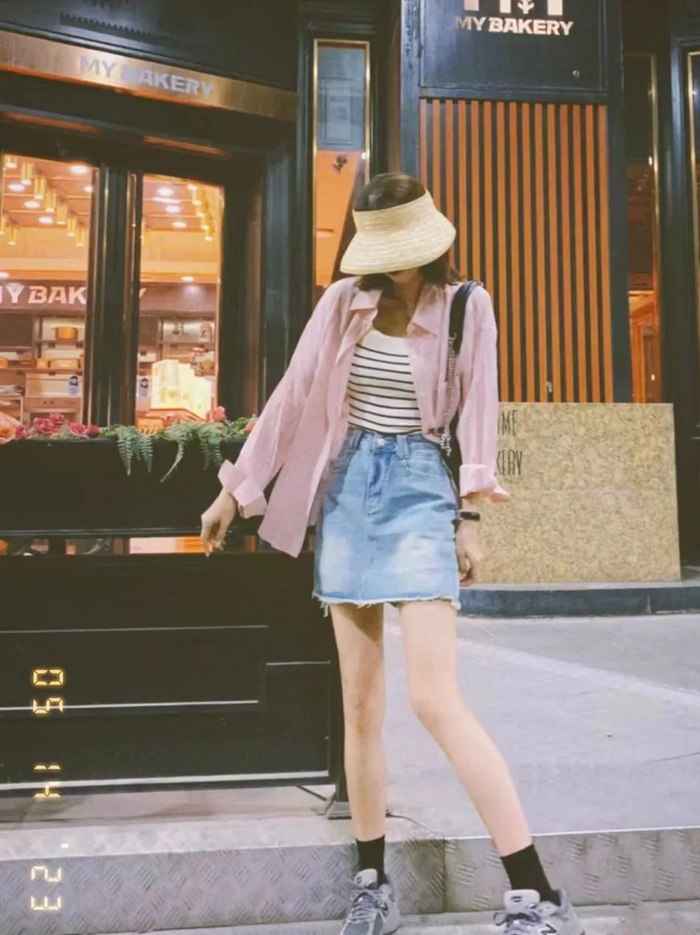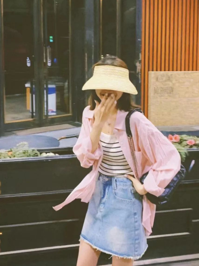 淡粉色的衬衫就是一种甜而不腻的单品,没有这种“装嫩”顾虑,搭配上淡蓝色的牛仔裙青春又时髦。