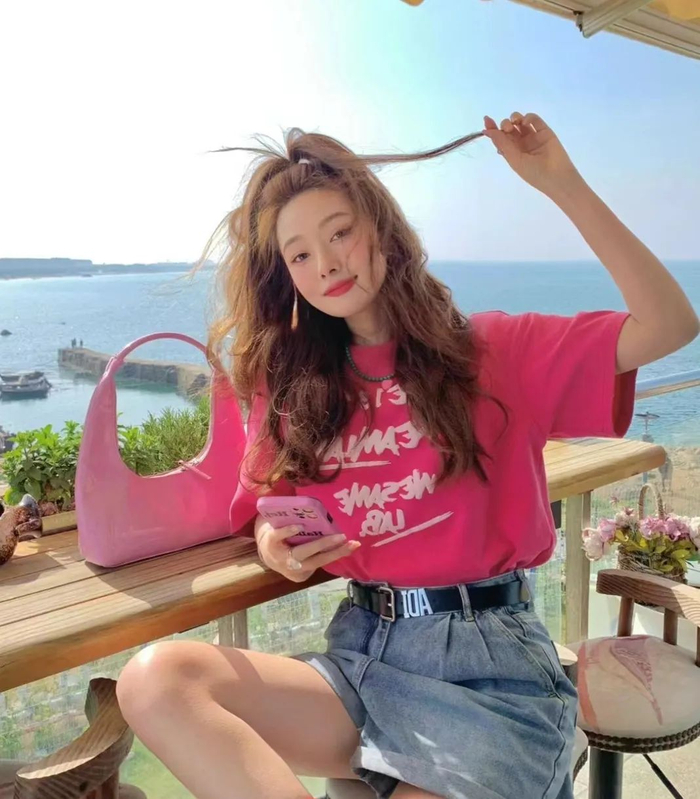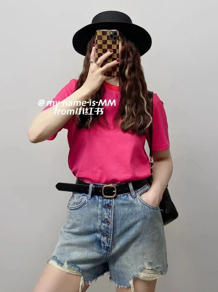 粉色T恤在颜色和印花上会比衬衫的选择更多,印花芭比粉T恤搭配水系牛仔裤非常鬼马活泼。
