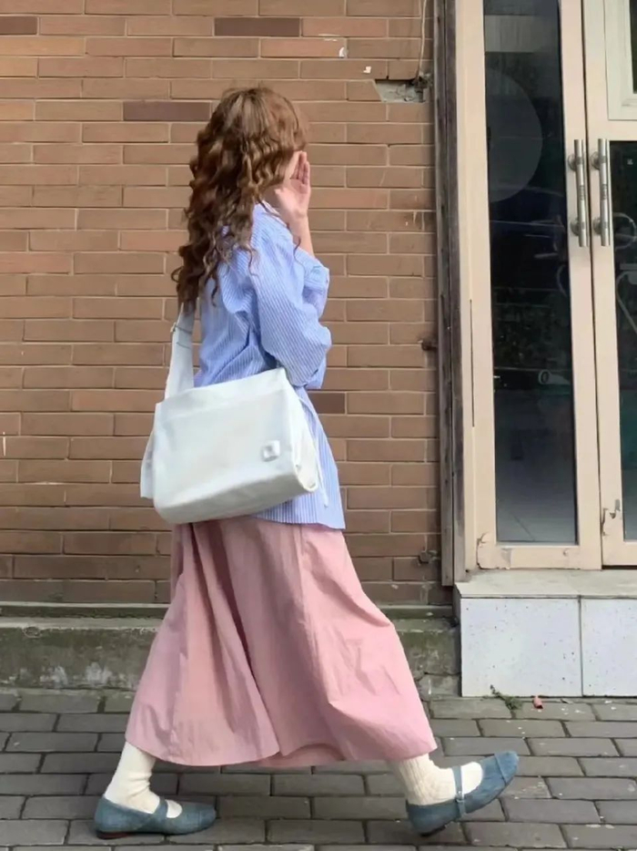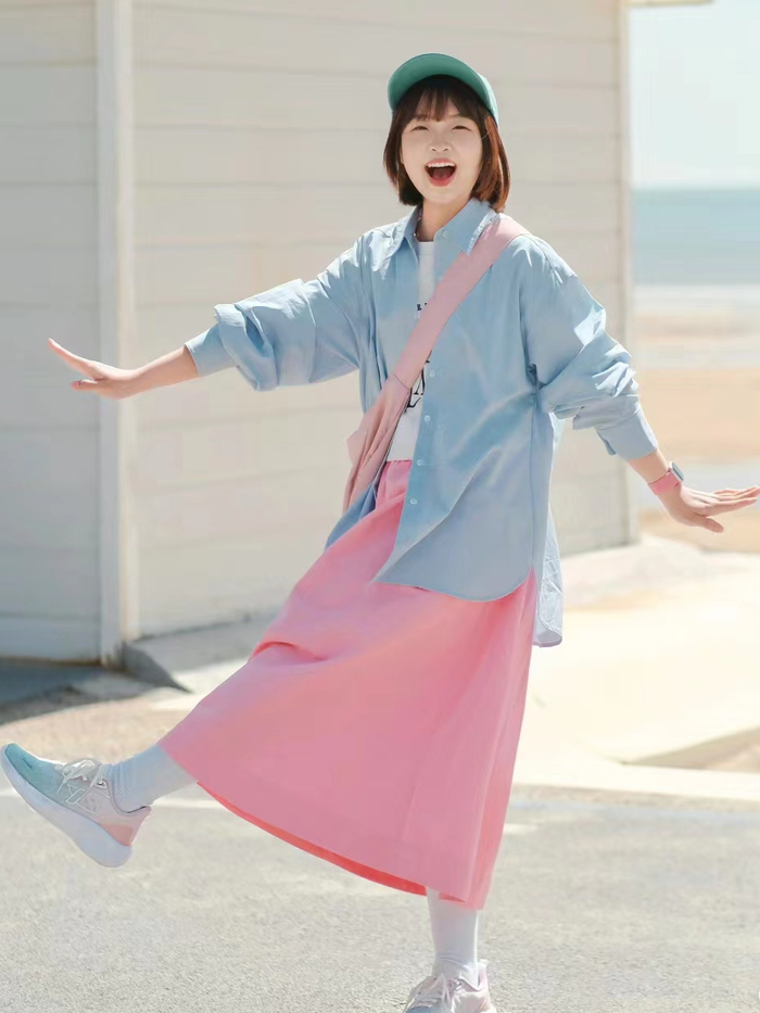 蓝色的衬衫人手一件,想要穿搭不烂大街,搭配粉色裙子一定会让人耳目一新。