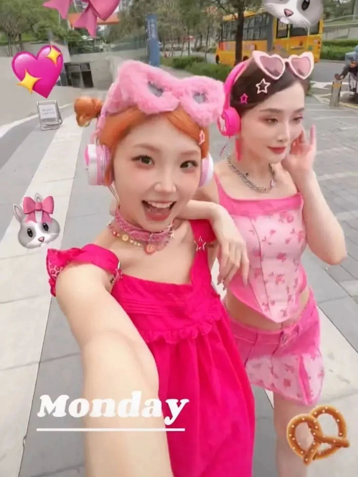 两种高饱和度的色彩搭配在一起容易甜腻,就更需要注重层次感和配饰的搭配,让穿搭看上去更“灵活”,去减轻色彩的负担感。