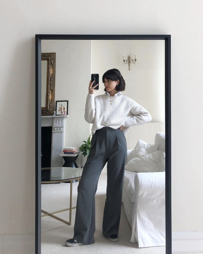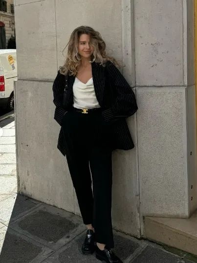 西装裤其实就是很好的选择,自带腰褶的设计,能够在视觉上收缩我们的腰部线条,拉高腰线。长度最好是拖地,延伸感更强,穿上就是大长腿。