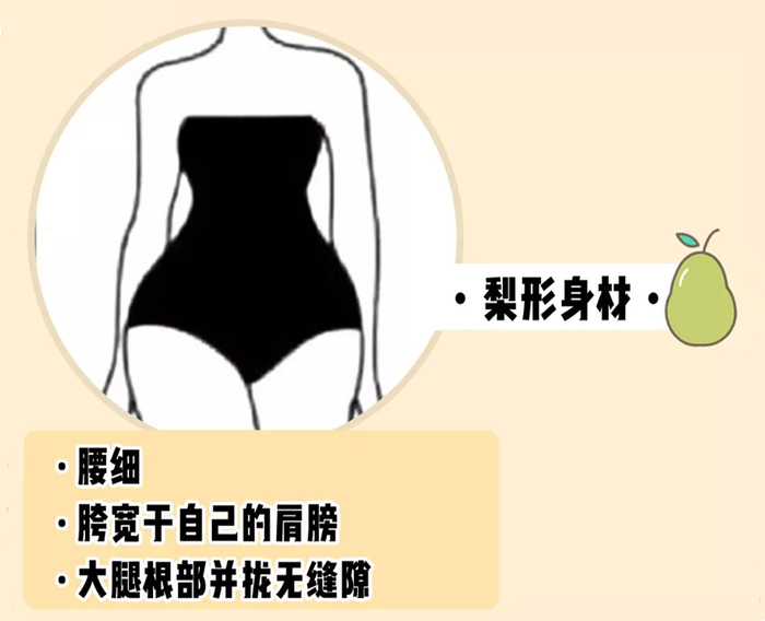 梨形身材的体型上窄下宽,背窄、肩窄、腰细,但臀部和大腿比较粗。