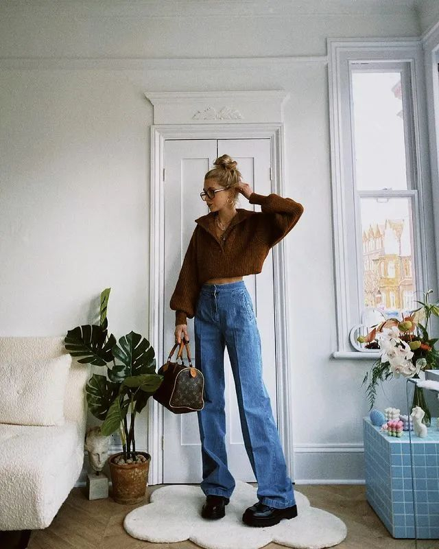 ②高腰裤加上短款上衣可以使身材比例更佳,让整体显得修长协调