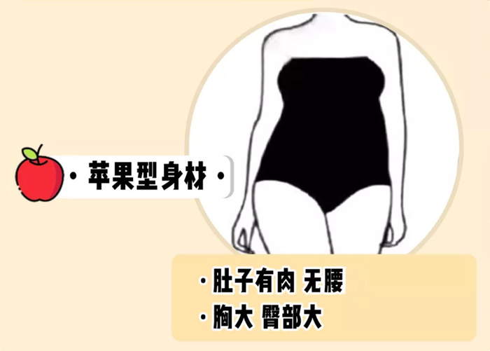 苹果型身材的特点是上半身较宽、腹部有一些赘肉,腿部通常较为纤细。因为腰部没有线条,容易堆积赘肉。