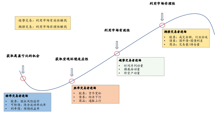 我们先来看投资的四种盈利模式:赔率交易、胜率交易、趋势交易、拥挤交易。从一个牛熊循环周期来看,资产价格的不同阶段对应着不同交易者的进场。
