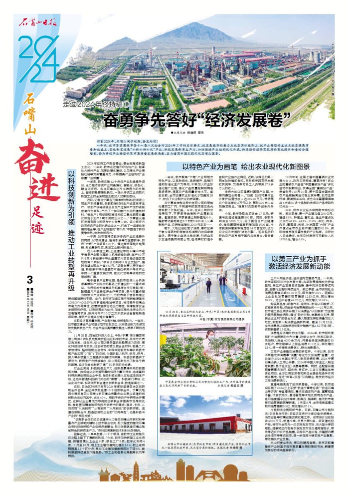 回首2024年,石嘴山阔步赶潮,奋发向前!一年来,我市紧紧围绕市委十一届八次全会对2024年工作的总体要求,把发展经济的着力点放在实体经济上,把产业转型的主攻点放在提高质量和效益上,因地制宜发展“六新六特六优”产业,积极发展新质生产力,加快推进产业结构优化升级,持续推动经济实现质的有效提升和量的合理增长,努力开创产业转型示范市高质量发展新局面,奋力谱写中国式现代化石嘴山篇章。