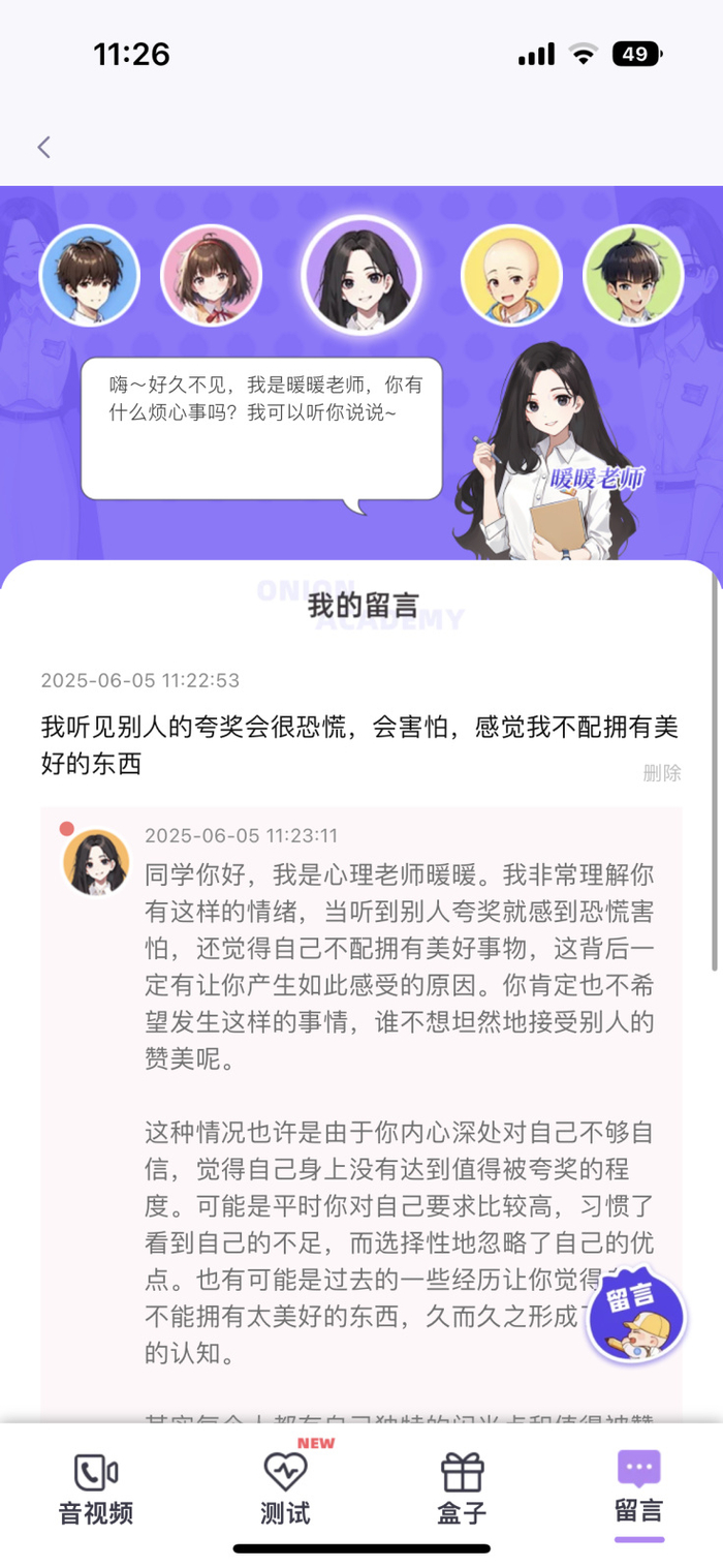 尤为重要的是,“洋葱树洞”所提供的高质量情感支持也正通过AI技术打破地域限制,惠及更多偏远地区的学生。