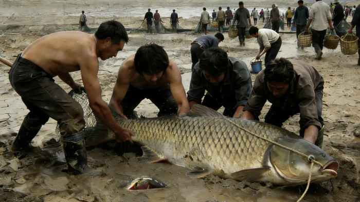 水被抽走得很快。鱼无处可藏。大的草鱼横躺在泥浆里,尾巴拍打出闷响。人们围了上来,拿着桶、撮箕、渔网、背篓。