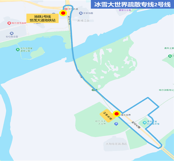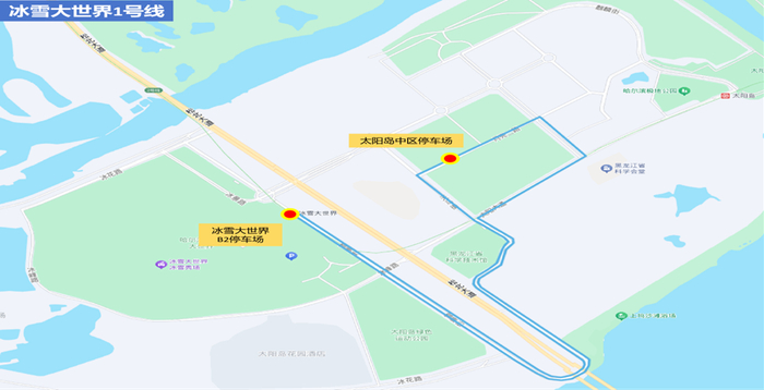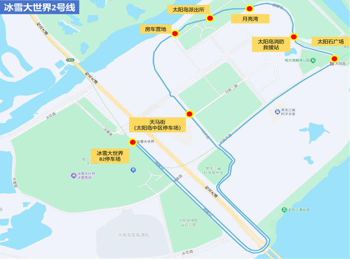 5.冰雪大世界2号线(免费):由冰雪大世界B2停车场发车,经雪景街、科技馆、太阳大道、麒麟路、太阳岛北部环线、天马路、科技馆、雪景街返回。