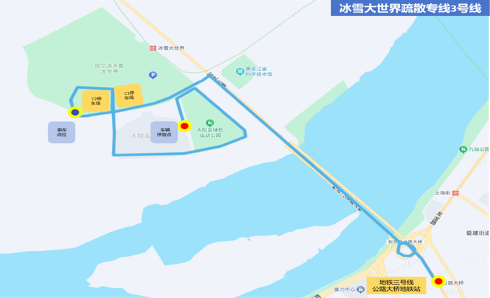 3.疏散专线3号线(免费):设置两条支线,分别从冰霜路、太阳岛堤坝发车,直达公路大桥地铁站(地铁3号线)。