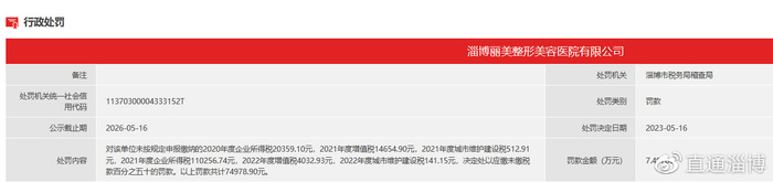 淄博税稽罚〔2023〕6号行政处罚决定书显示:淄博市丽美整形美容医院有限公司存在利用个人账户进行收款未确认收入,未按规定申报增值税及附加税费、企业所得税违法事实,违反了《中华人民共和国税收征收管理法》第六十三条第一款,对其罚款7.49789万元。
