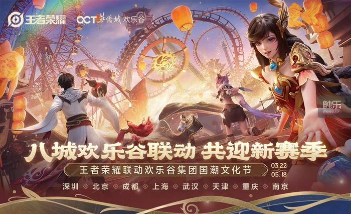 在最近,结合新版本和五五开黑节背景,《王者荣耀》在8个城市的欢乐谷举办了特色活动,在部分地区,如果你的游戏等级超过30级,购票还会有不小的优惠——这种紧密的结合已经超越了一般的“合作”。游乐园里也有一系列如英雄Coser巡游、主题演艺表演和电竞比赛等线上线下组合,直接助力当地旅游的活动。