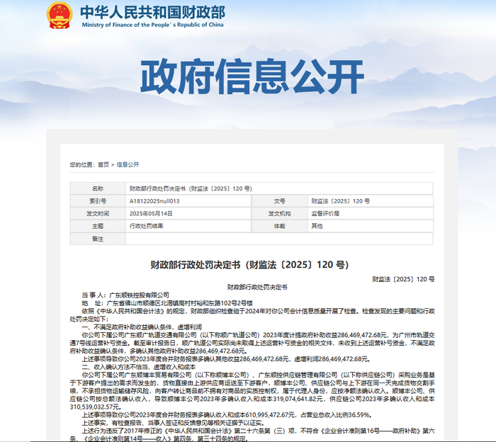 公告显示,上述行为违反2017年修正的《中华人民共和国会计法》第二十六条第(三)项,不符合《企业会计准则第16号——政府补助》第六条、《企业会计准则第14号——收入》第四条、第三十四条的规定。依据2017年修正的《中华人民共和国会计法》第四十二条第一款第(三)项的规定,财政部决定给予广东顺铁控股有限公司罚款3000元的行政处罚。