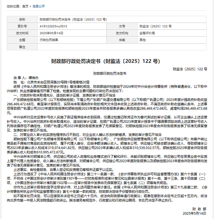 近日,财政部公示数条行政处罚信息。其中,广东顺铁控股有限公司下属公司在截至审计报告日没收到政府补助资金情况下多确认政府补助收益,虚增利润并使用不恰当收入确认方法,导致该公司2023年度合并财务报表多确认收入和成本超6亿元,被罚款3000元,同时审计报告的签字注册会计师亦被警告。