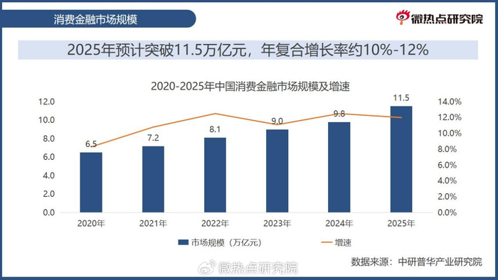 据中研普华产业研究院发布的《2025年消费金融行业投资策略分析及市场深度研究调研报告》中指出,2024年中国消费金融市场规模达9.8万亿元(同比+12.5%),2025年预计突破11.5万亿元,年复合增长率约10%-12%。