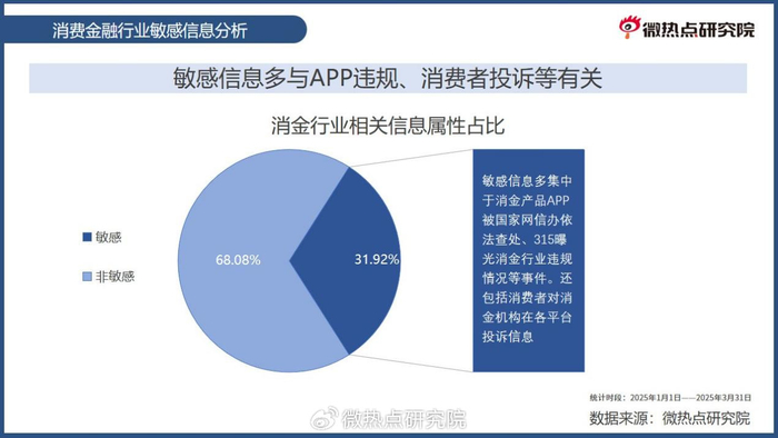 从信息属性来看,消费金融行业相关的非敏感信息占比为68.08%,舆论情绪总体趋于正面。敏感信息占比为31.92%,主要集中在消费金融产品APP被查处、315期间曝光消费金融行业违规情况等负面事件,以及消费金融用户在微博、抖音、黑猫投诉[下载黑猫投诉客户端]等平台上的投诉信息。网络舆论的关注和讨论,对消费金融公司的形象和声誉产生一定影响。
