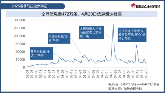 2025年2月1日至5月20日,与“马拉松”相关的原发信息量达472.31万条,日均传播量为4.33万条。从信息传播趋势来看,相关信息量呈波动走势,苏州马拉松“小便门”事件、无锡马拉松“亲密”事件、人形机器人半程马拉松赛举行、多地马拉松赛事“致敬母亲”等事件引发舆论不同程度的关注。4月19日,北京亦庄机器人半程马拉松开跑,#机器人如何备赛半程马拉松# #宇树科技回应机器人马拉松摔倒#等相关话题登上多平台热点榜单,引发舆论热议,相关信息量于20日达峰值27.4万条。