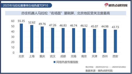 统计2025年部分已完赛的马拉松举办地的热度可见,北京、上海、重庆三地上榜三甲。其中,北京大兴与亦庄两站半程马拉松赛,因“林田花海特色赛道”和“人机共跑模式”受到舆论较高关注,部分网民用“一城春色半程诗”“钢铁之躯跨越速度边界”等语言评价北京站赛事。上海的半程女子马拉松赛与亚洲首创的“轮滑+路跑”融合马拉松赛事也备受关注,赛场的女性力量与特色项目引发舆论广泛赞誉。重庆·荣昌半程马拉松赛上,曾因投喂美国网红“甲亢哥”走红的荣昌网红博主卤鹅哥现身助力,#“卤鹅哥”亮相重庆荣昌半马# #卤鹅哥在荣昌半程马拉松终点投喂#等话题登上多平台热搜榜,推高了举办地重庆的热度。