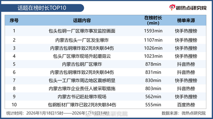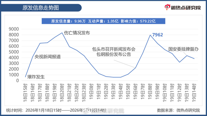 2026年1月18日15时5分,包头市包钢一厂区发生爆炸事故,23小时内,全网原发信息量近10万条。从网民最初对“强震”的困惑,到对伤亡数字的痛心与对事故原因的关注,再到对监管的聚焦,舆论情绪随着事件信息变化,清晰地折射出公众对重大安全事故的复杂情绪与核心关切。