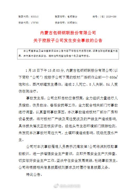 19日7时许,包钢股份发布公告。其中提及,经包头市生态环境部门跟踪检测,未发现本次事故对周边大气、土壤环境造成影响,现场无废水产生。