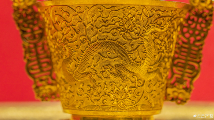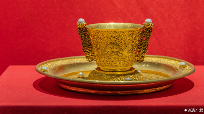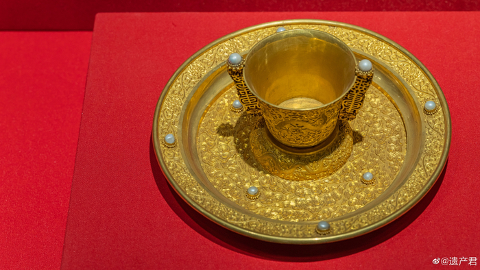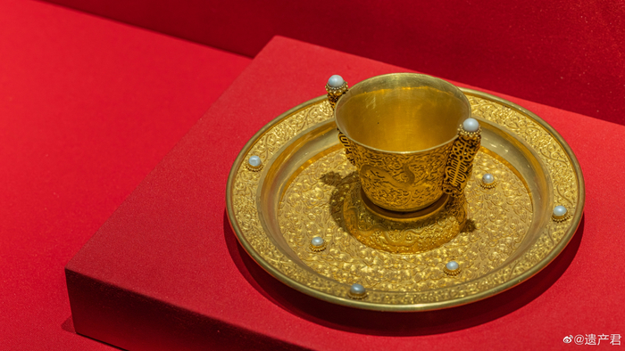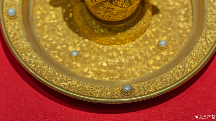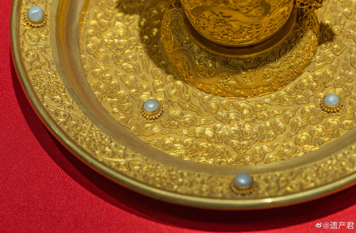 金杯盘为一套,通高7.3厘米,杯口径7.1厘米,盘径9.5厘米。金盘亦在边缘饰勾莲纹一周,其间嵌东珠八颗,盘心凸起,其上錾刻龙戏珠纹,盘内錾刻云纹,奢华大气。