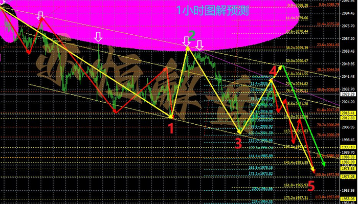 1小时图高点2088跌至2013看作超跌1浪,从2013涨至2062看作2浪反弹,然后2062跌至2001看作3浪下跌,上周四从2001涨至2039看作震荡死人浪(4浪)反弹,4浪会不断的诱多诱空开启。最后走下跌5浪及延长5浪复式浪1975-1946-1870附近!