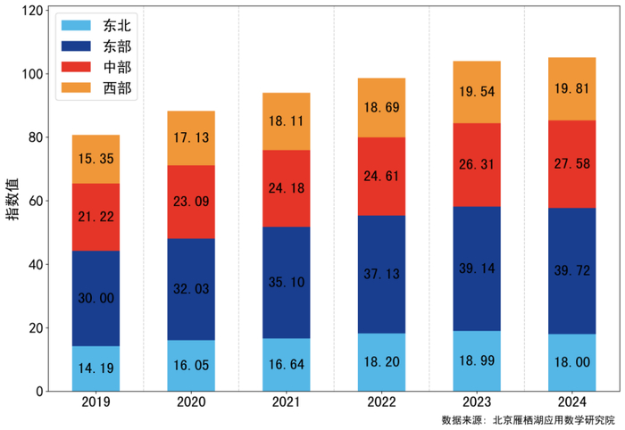 东部地区凭借经济基础与创新资源,2024年数字经济指数达39.72,持续领跑;中部地区追赶势头强劲,50%省份进入“高指数高增长”梯队;西部地区依托政策支持与算力优势,50%省份实现“低指数高增长”;东北地区稳步跟进,逐步探索数字化转型路径。