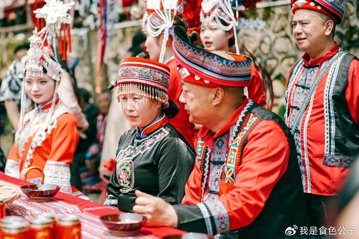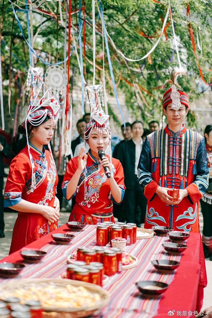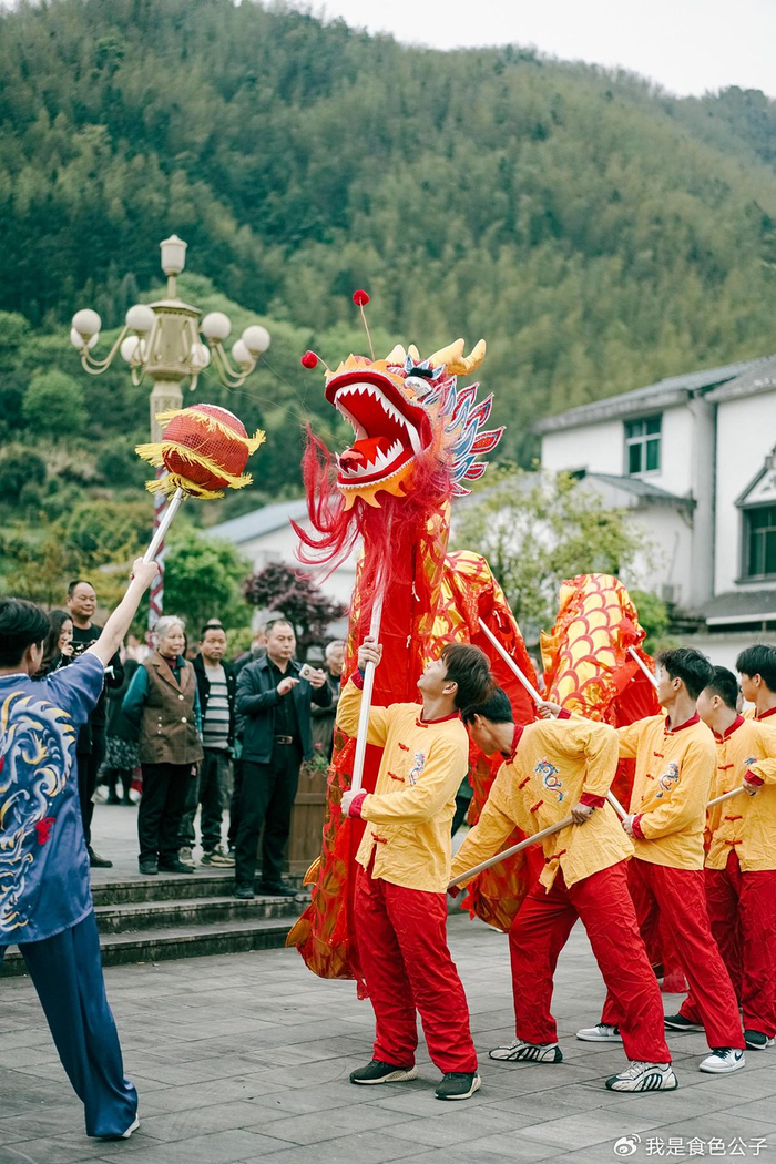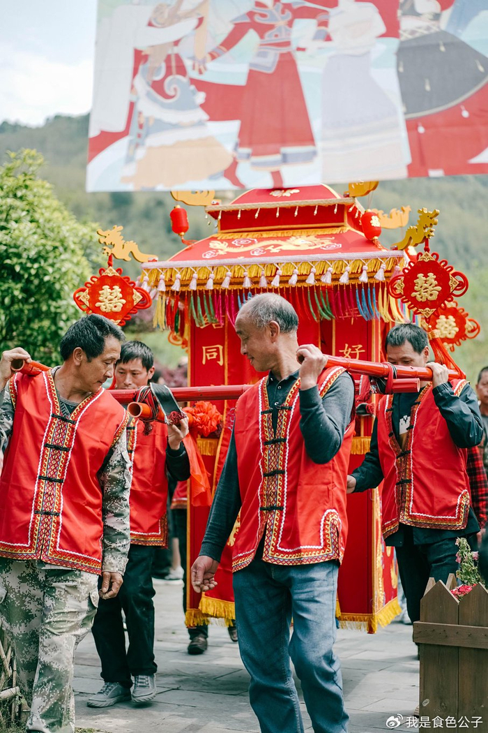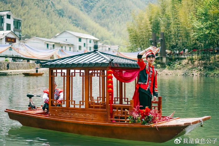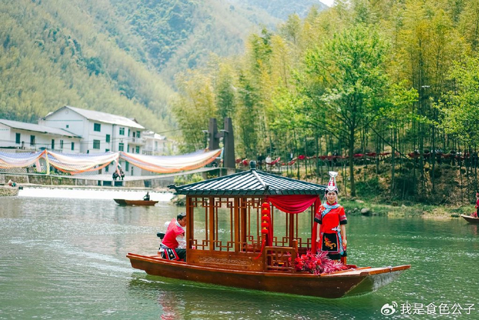 跟着祈福巡游队伍一起巡游,参与到这热烈的文化巡游中。身穿畲族服饰的阿哥和阿妹在船坑村的“凤凰湖”的竹筏上对唱,对歌形式和题材丰富多样,带着五府山畲族特有的民俗文化,歌声悠扬婉转,令人沉醉。畲族婚俗是国家非物质文化遗产之一,迎亲会设有拦路酒、竹竿舞、对歌、猜谜语、上花轿等环节,整个婚礼过程隆重又热闹,在场的每个游客都被这种喜庆氛围所感染,感受到畲族婚俗文化的传统魅力。