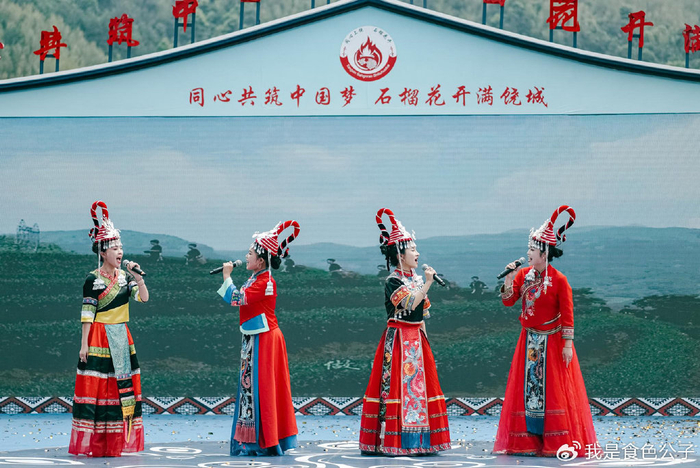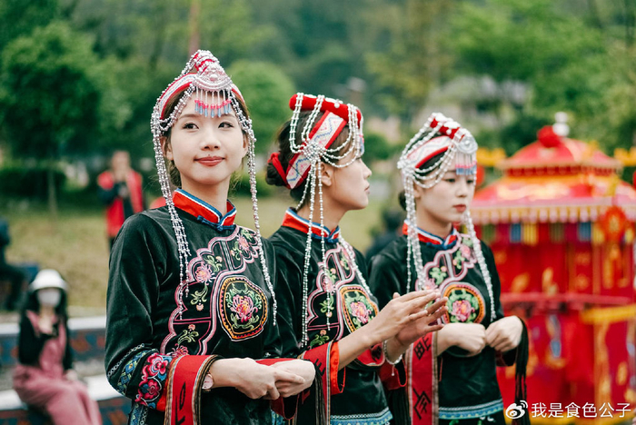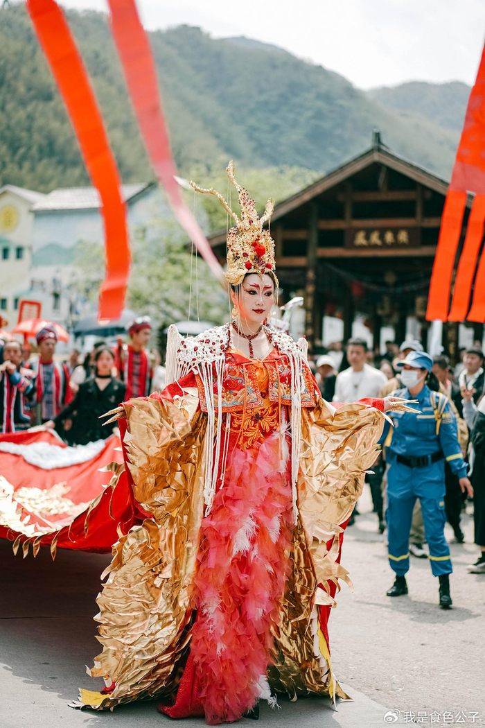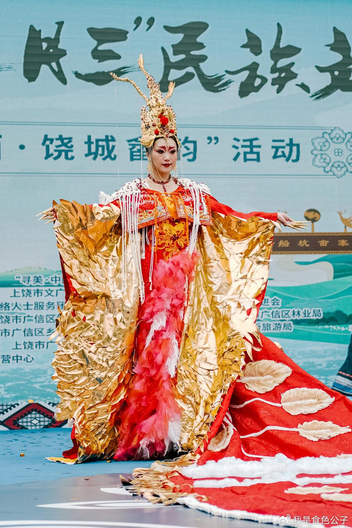 最令人难忘的莫过于龙凤飞天,凤凰作为畲族的图腾,龙则是今年的生肖,龙凤齐飞,翱翔在天空中,也寓意着畲族人民的幸福美好和中华民族的繁荣昌盛!其次还有历时一个多月全手工缝制的「凤凰服」,灵感来源于畲族的凤凰图腾,展现了畲族人民的英勇和民族气节。