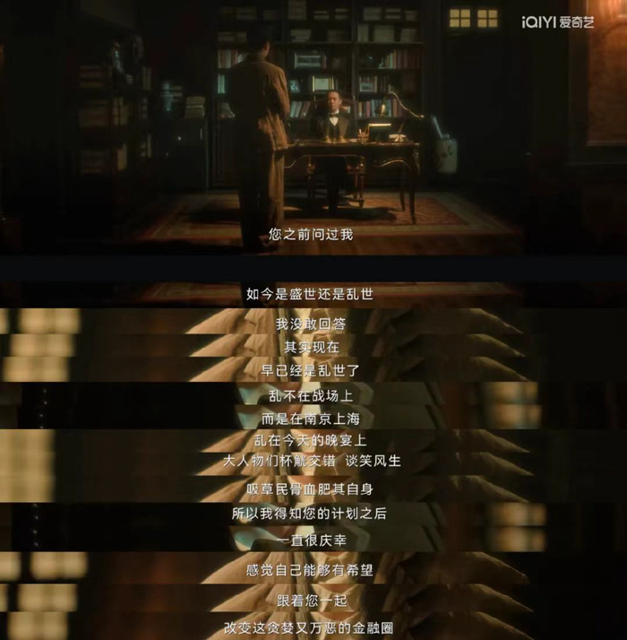 “开始是双雄斗法,定了主要演员之后,我就想拍一部小人物成长史,越拍越往这方面走了。最终剪辑的时候,我又重新梳理一遍,用魏若来的独白开场,用他的独白结束,形成逻辑闭环,讲述一个普通人的成长——他是怎么被乱世裹挟、挣扎生存,艰难选择一条路,最终实现自己目标的。”