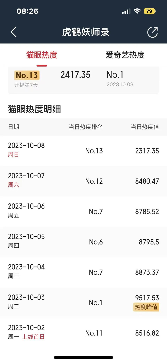 10月2日上线当天,《虎鹤妖师录》的猫眼热度值就突破了8500,并于开播次日登顶猫眼热度总榜,热度峰值为9517.53。由于猫眼热度峰值综合考量了多个媒体平台的讨论、话题和搜索等相关数据,可见《虎鹤妖师录》的开播关注度算得上顶配。