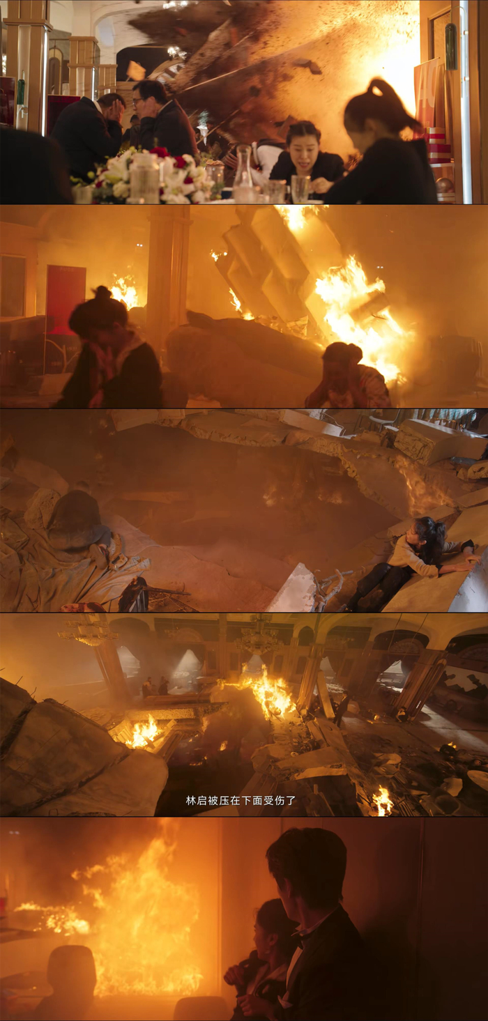 以第30集酒店高楼宴会厅的那场火灾重场戏为例。外景中酒店高层的燃烧和爆炸,是人力所不可为的,只能用电脑特效去做。为了足够以假乱真,这些画面里的电脑特效打磨了很长时间,是全片最后完成的特效镜头。甚至在播出前五天,天毅还去机房又审了一次。