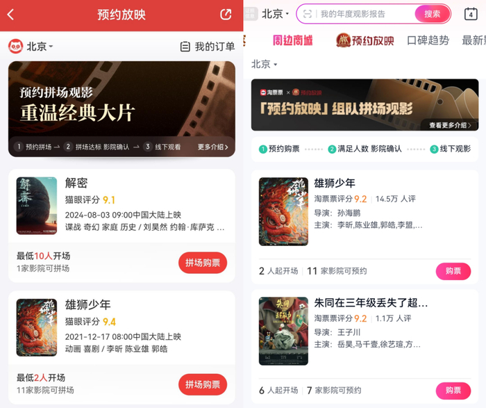 2023年中影集团推出了“中影预约”,并在自家APP“中国电影通”上设立了专属板块,目前已覆盖全国数千家影院。它的优势在于放映周期的灵活和预约选择的多元。