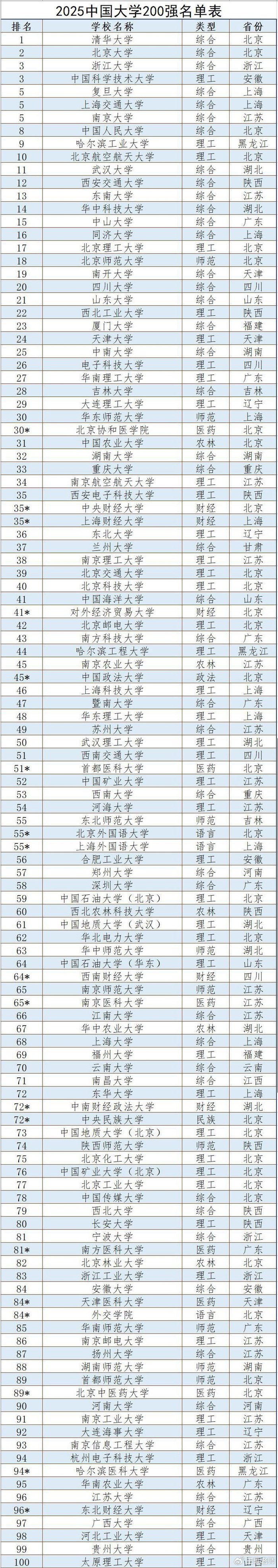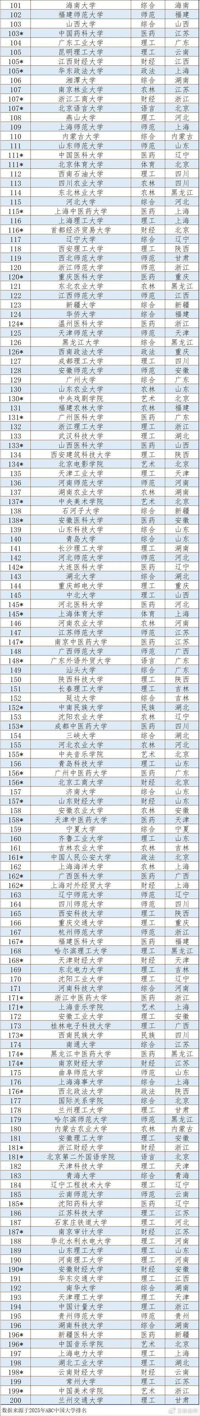 前不久,2025年ABC中国大学排名正式发布,共有1210所本科院校上榜(含公办和民办)。笔者根据该排名数据,制作了“2025中国大学200强名单表”。