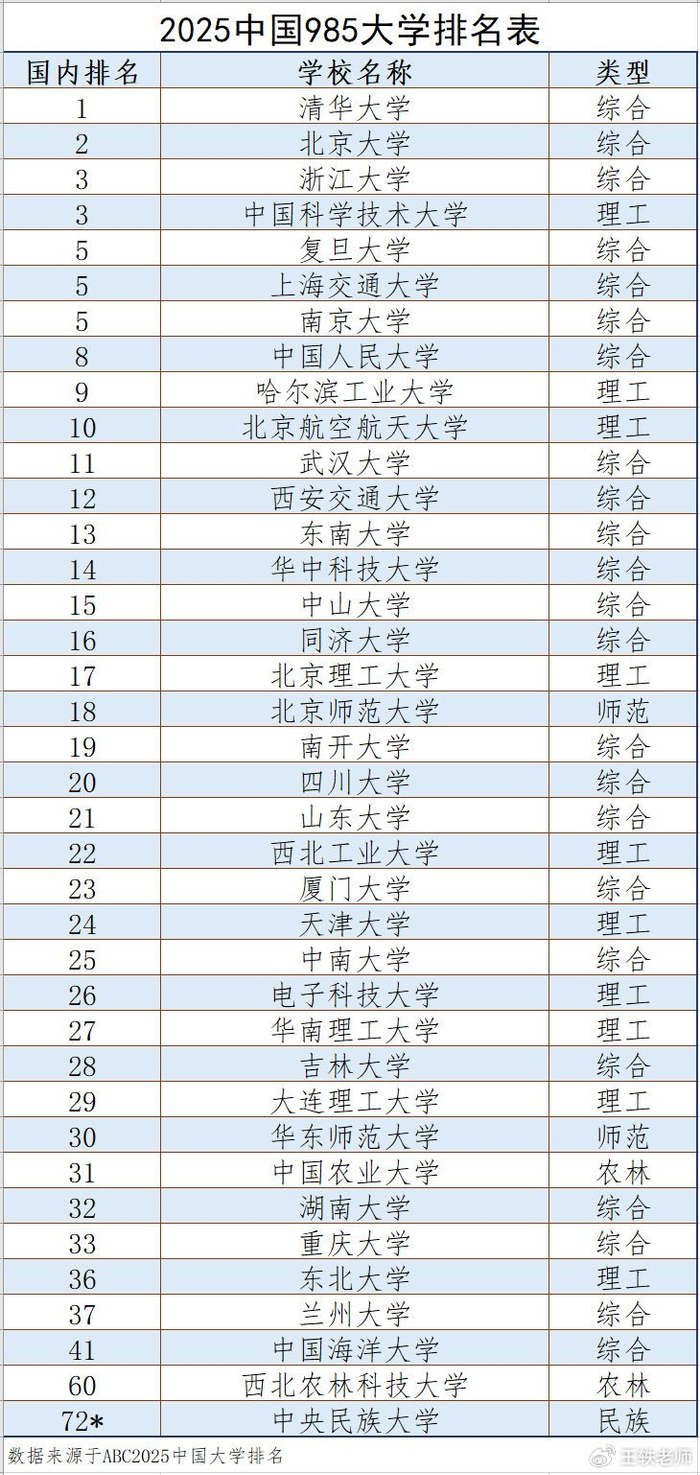前不久,ABC2025中国大学排名发布,笔者根据该数据整理了“2025中国985大学排名表”。清华大学和北京大学分别位列全国第一和全国第二,具体名单如下。