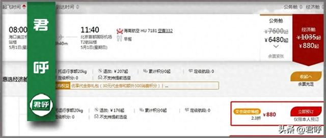第六步: 已通过身份认证的特殊贡献旅客进入机票预订页面可展示标签和下浮价格进行预订。