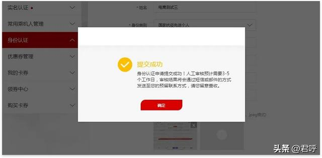 4.提交认证申请后人工审核需要3至5个工作日,审核通过系统将自动更新您的身份状态,审核不通过将通过短信或邮件告知失败原因,请按照要求重新提交材料。